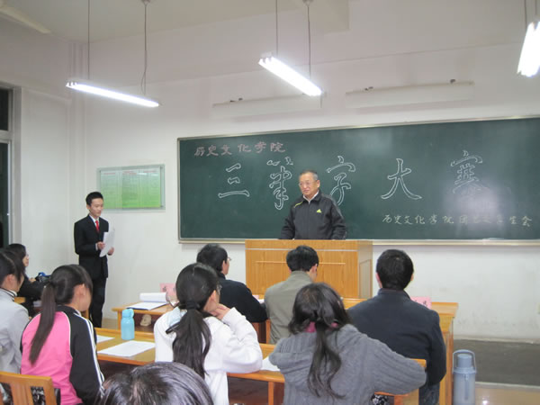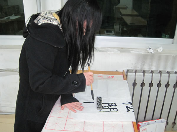 大赛分粉笔组、钢笔组和毛笔组三组。简单的开幕式过后,各项比赛在各个赛场拉开了帷幕。62名参赛选手准备充分,实力非凡。粉笔组赛场最为热闹,选手登台书“激扬文字”,评委“指点江山”,各位老师肯定了同学们在比赛中表现出的睿智和实力,同时也毫不客气的指出大家的通病:基础不扎实,疏于练习。臧老师给大家做了示范,给予大家更高的要求。参赛选手风格各异的作品、评委老师幽默风趣的谈吐,使得赛场热闹非凡,在轻松愉快的比赛环境中,杨鹤同学最终脱颖而出,摘得粉笔组的桂冠。
