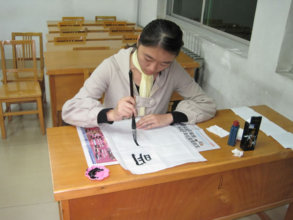 和粉笔组赛场相比,毛笔组和钢笔组的比赛则进行的“悄无声息”。毛笔组的11位选手静心凝神,以精湛的技艺和娴熟的笔法在雪白的宣纸上书写着自己的“精”、“气”、“神”,观众不时发出“啧啧”的赞叹声。钢笔组阵容强大,共有44名选手,整个赛场座无虚席。大家尽兴挥笔,或楷书,或隶书、或行书,都在规定的时间内完成了既定内容的书写。