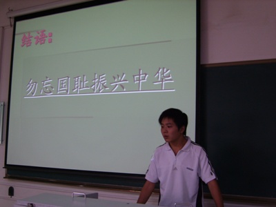 此次活动的主讲付心中、王勇、王继敏同学,借助展示的大量真实、宝贵的图片资料,详细的向同学们讲述了九·一八事变的来龙去脉,分别从不同方面分析了九·一八事变的背景、经过及影响。又结合当前的国际形式号召大家勇于承担起当代老员工的历史使命。精彩的讲课使大家对九·一八事变有了更深层次的认识,对此,同学们纷纷发表了对九·一八事变的看法。下午六时,此次活动在“勿忘国耻 振兴中华”的结语和同学们的阵阵掌声中圆满结束。