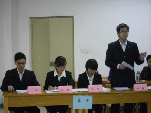 比赛由立论陈词、攻辩及攻辩小结、自由辩论、总结陈词环节组成。比赛场面十分精彩,参赛选手表现十分优秀,赛前双方都做了充分的准备,辩论中论点明晰,论据充足,分析透彻,引证有力,在论证了本方观点的同时牢牢抓住对方的弱点,各个击破,并充分展示了团队的风采。选手们妙语连珠,唇枪舌战,他们的精彩发言点燃了全场的气氛,博得了在场评委和同学们的阵阵掌声。