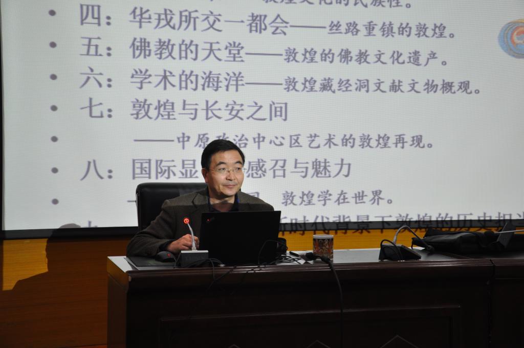 沙武田教授的讲座一共由八个部分构成。在讲座的第一部分,沙老师通过对敦煌地理位置的辨析,向大家讲述了阳关和玉门关的两关文化及其人文情节,并详细介绍了阳关和玉门关设立的军事和交通意义。第二部分中,沙老师依托敦煌的历史概况,阐述了汉文化的边疆守护。第三部分中,沙老师介绍了敦煌作为历史时期的民族汇集地,其地域文化所具有的丰富民族特性。第四部分中,沙老师通过考察历史文献,向大家讲述了敦煌长期作为丝路国际商人、粟特胡人的中转站、货物集散地和中外使节交往的桥头堡,在中西交通中发挥着不可或缺的作用。第五部分中,沙老师阐述了敦煌的佛教文化遗产和敦煌藏经洞文献文物的概观,并指出敦煌是佛教的天堂和学术的海洋。第六部分中,沙老师强调,敦煌的价值是多方面的,其中包括对中原政治文化中心隋唐长安城的文化再现与认知。第七部分中,沙老师阐述了“敦煌在中国,敦煌学在世界”的具体内涵,他指出,敦煌学现已发展成为当今世界的一门“显学”,其研究对象之广,研究价值之高,无与伦比。在讲座的最后一部分中,沙老师结合“一带一路”的贸易战略向大家介绍了新时代背景下的敦煌历史担当。