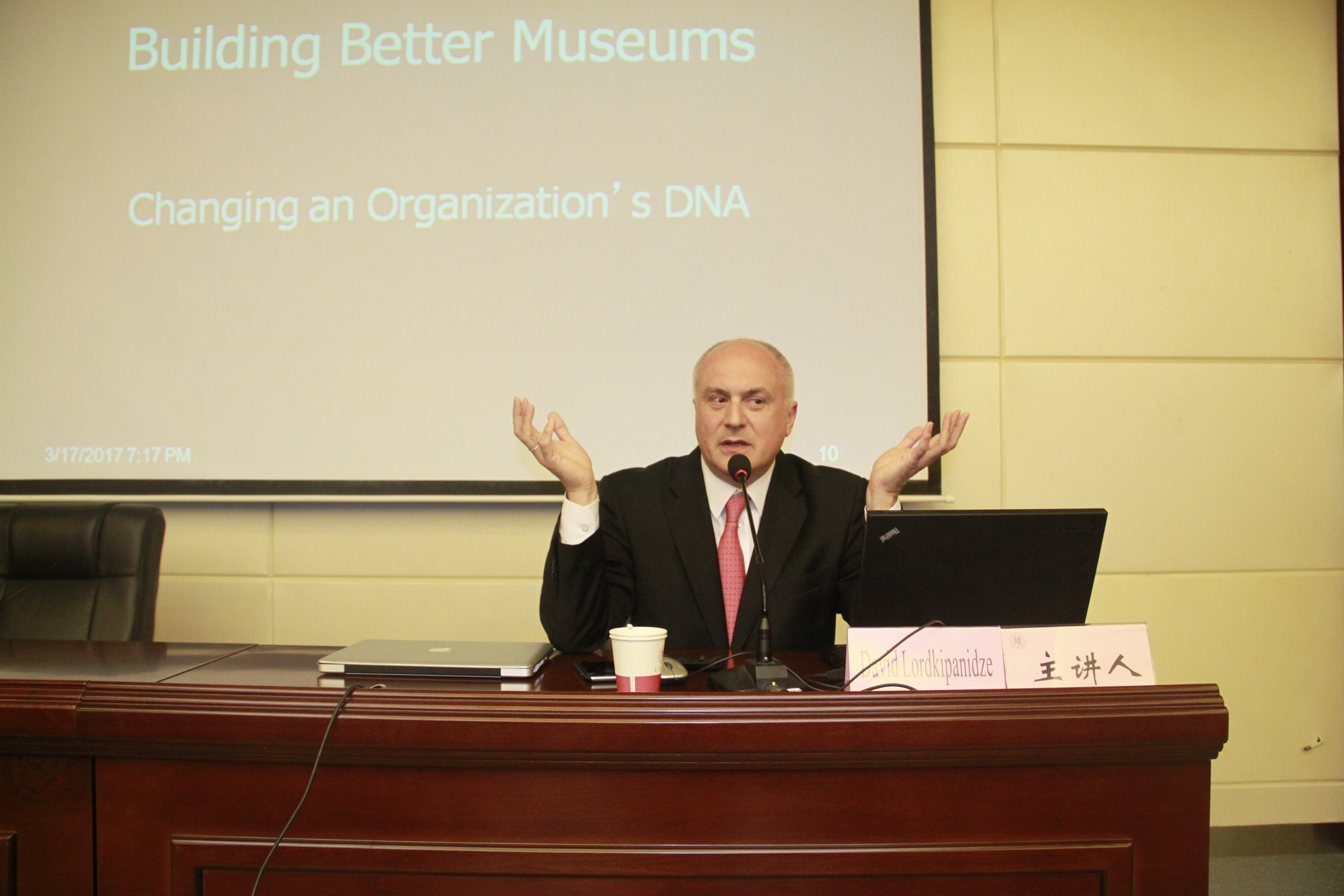 本次讲座分为两个部分。首先,David教授对博物馆的概念、功能、任务、建设等一般问题做了简要的介绍。David教授认为,现代博物馆是科技与艺术相碰撞的地方,它的功能是使科学面向公众,建立科学与公众的纽带。他通过对比传统图书馆和现代博物馆的差异,指出现代博物馆需要增强活力,适应社会,不仅要考虑自身的发展,还要考虑竞争对手带来的压力,否则就会像恐龙一样灭绝。然后,David教授介绍了格鲁吉亚国家博物馆的概况。他以发掘德马尼亚原始人考古遗址为例,重点介绍了格鲁吉亚国家博物馆的研究功能。他认为,尽管现代博物馆出现了包括虚拟博物馆在内的多种形式,但展出的内容才是博物馆的核心所在。此外,多学科交流和国际合作,也是现代博物馆发展的应有之义。