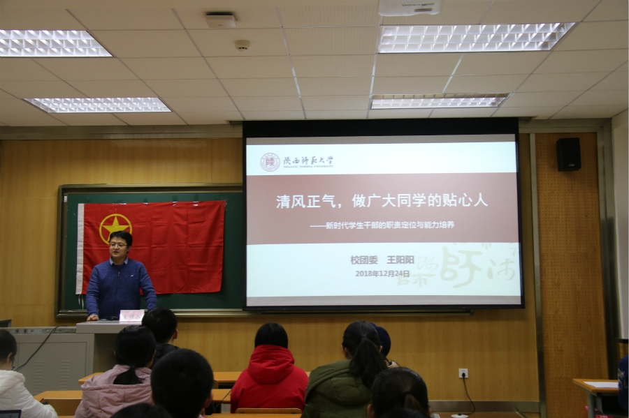 2018年12月25日晚,best365中国官方网站初级团校第三讲在陕师大长安校区文渊楼开讲,校团委副书记王阳阳老师为同学们作了题为《清风正气,做广大同学的贴心人——新时代员工干部的职责定位与能力培养》的主题报告,best365中国官方网站团委书记洪海安老师主持了此次培训会。