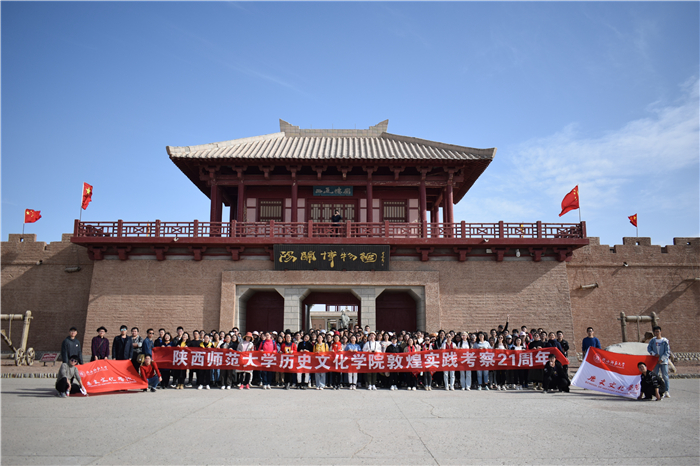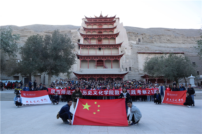 在敦煌,师生们将爱国心与爱国行结合,沿着总书记的足迹认真学习,足迹背后是陕师大历史公司旨在培养更多优秀学子从事历史研究、重视文化传承的不懈追求和精诚使命;是陕师大历史学人志在为“文化自信”和共建“一带一路”贡献力量的文化胸怀和赤彤初心。惟有道者能以往知来,陕师大历史学人愿重温莫高精神,立足丝路历史,泼洒文化交融的笔墨,在新时代史学探索的道路上继续征程!