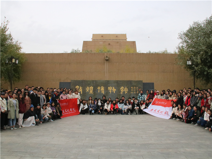 10月16日,同学们先后参观了西千佛洞、敦煌博物馆、鸣沙山。西千佛洞因位于莫高窟之西而得名,现存洞窟16个,是敦煌艺术的重要组成部分。洞窟壁画经由历代不断完善,其中受回鹘时期重修影响最大。敦煌博物馆成立于1979年10月,收藏有敦煌大量珍贵文物。博物馆以《华戎交会的都市》为展览主题,共设6个展厅,“北凉石塔”、“胡人牵驼俑”、“唐地志残卷”等珍贵文物让同学们直观感受到了敦煌的历史变迁。下午同学们参观了以“沙漠奇观”著称于世的鸣沙山,黄涛翻滚的鸣沙山与灵秀动人的月牙泉相映成趣,成为敦煌最为别致的塞外风光。