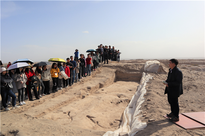 10月18日,考察的目的地是古代西域具有重要军事意义的玉门关和阳关。玉门关由18段长城,2座城址构成,同学们在这里实地考察了汉长城遗址、大方盘城遗址和小方盘城遗址。坐落在漫漫黄沙之中的阳关与玉门关遥遥相望。同学们重走阳关道,用脚步丈量历史,探索古时阳关的战略意义和敦煌的风土人情。