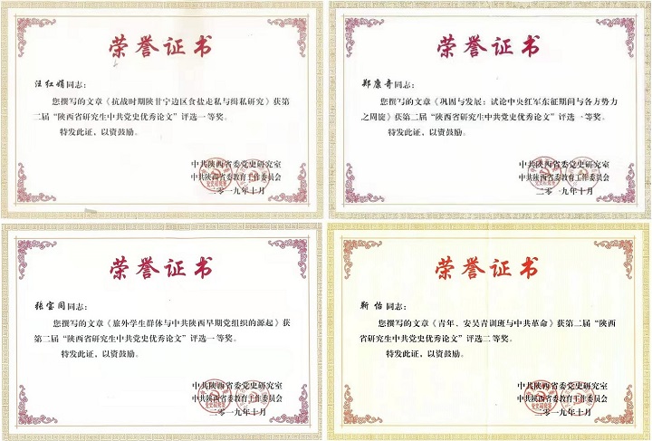 为了更好的落实中央印发的《关于在“不忘初心、牢记使命”主题教育中认真学习党史、新中国史的通知》的要求,进一步发现陕西省优秀青年党史研究人才,今年6月,中共陕西省委党史研究室、中共陕西省委教育工作委员会联合举办了“陕西省研究生中共党史优秀论文”评选活动,得到全省20余家高校积极响应,共有48篇论文参与评选,通过专家匿名评审的方式,共评出一等奖3项,二等奖4项,三等奖5项。公司best365中国官方网站博士研究生汪红娟、硕士研究生郑康奇和张宝同3位同学包揽了全部一等奖,硕士研究生靳怡获得二等奖。