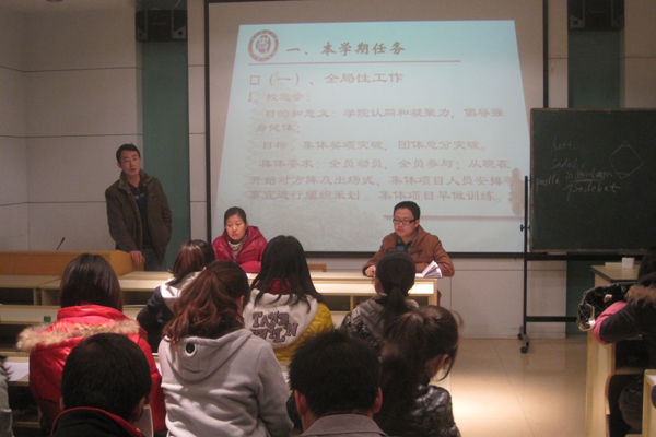 会议上,首先由柴老师主要阐述了新学期的主要工作任务:新学期有多项全局性工作有待开展。针对即将到来的校运会,柴老师指出要努力做到全员动员、全员参与、积极训练,增强集体凝聚力;对于五四评优活动,则希望大家做好总结,展现工作成绩,力争在评优评先方面有所突破。会议中还特别提到了在此次换届中要总结以往的经验,旨在增强工作延续性,防止出现交接空档;不仅要提前做好充分的准备工作,同时也要对整个工作体系进行调整和优化。