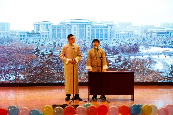 接下来精彩的表演节目陆续亮相。相声《校园趣事》以校园为翼,以历史为骨,融秦末枭雄争霸于相声,把趣味与知识相结合,展公司学子风采。