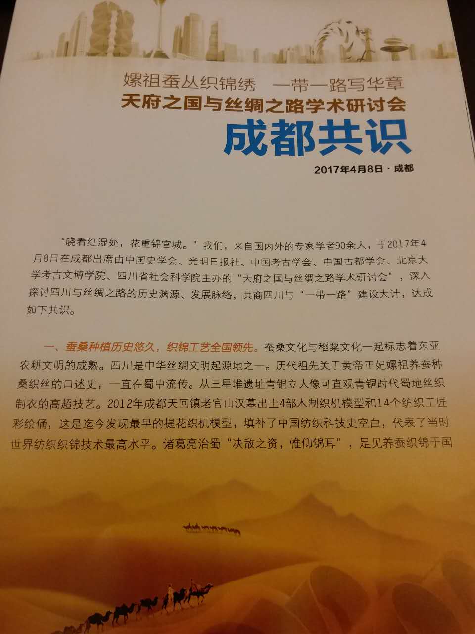三个分论坛讨论结束后,大会闭幕。在闭幕式上,大会发布《成都共识》,指出四川蚕桑种植历史悠久,织锦工艺全国领先。自古以来四川拥有多条商贸通道,辐射丝路沿线国家。丝路文化绚丽多彩,四川在历史上擅于利用丝路整合资源,为丝路商贸锦上添花。当代四川需大力弘扬丝路精神,切实促进民心相通。当代四川需推动区域发展腾飞,携手共建一带一路。