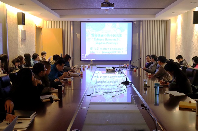 【集贤讲堂】2017年11月22日消息(撰稿:袁頔;摄影:张诗曼) 11月22日晚,主题为《粟特壁画中的中国元素》学术讲座在文汇楼C段424会议室举行。此次讲座由意大利拿坡里大学东方学专家康马泰教授主讲,公司丝绸之路历史文化研究中心沙武田教授主持,公司部分师生积极参加了这次活动。