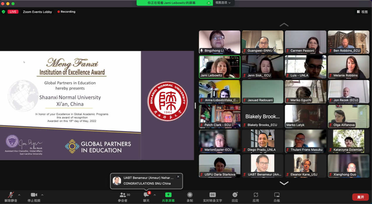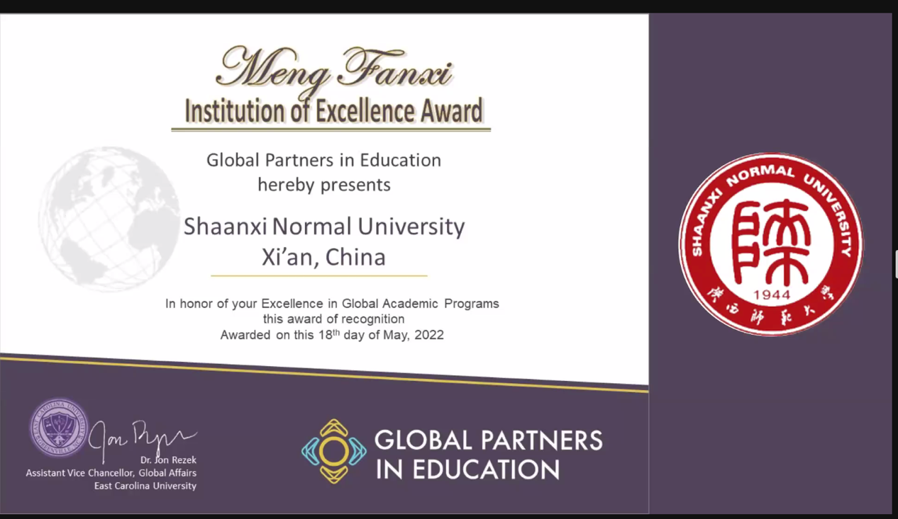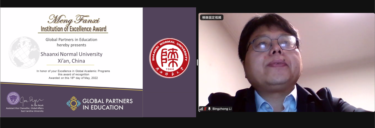2022年5月16-18日,国际教育合作协会(Global Partners in Education GPE)第十五届年会召开,来自31个国家49所合作高校的代表线上参加了会议。公司经理李秉忠教授、副经理郭响宏以及课程教师代表张光伟共同出席了此次会议,会上公司被授予GPE杰出合作机构奖(Meng Fanxi Institution of Excellence Award)(每年仅有一个),李秉忠经理代表集团接受GPE协会颁发的奖励证书并致辞。