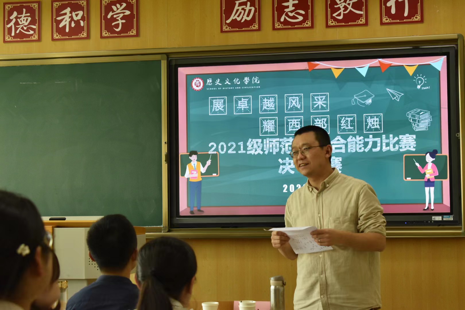 郭响宏在总结讲话中对2021级师范生取得的成长进步给予肯定,对评委老师的大力支持和工作人员的辛劳付出表示感谢,希望历院学子们聚焦核心素养提升,在学习和锻炼中不断厚植家国情怀,练就过硬的基本功,以追求卓越的进阶意识,紧跟时代发展趋势,领会国家教育战略,成长为一名卓越的新时代历史“四有”好教师。