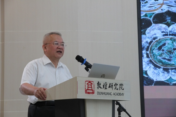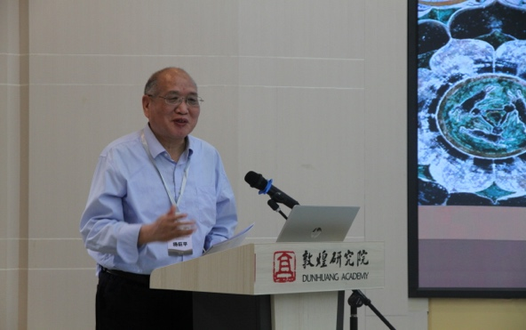 开幕式后,主题报告环节分为两个阶段。第一阶段为会议主旨发言,葛承雍教授围绕“从西域到敦煌的穹顶画到藻井的演变”、杨巨平教授围绕“敦煌佛教艺术的希腊化渊源”、敦煌研究院副经理张元林研究员围绕“莫高窟第249窟窟顶雉堞图案的来源”、暨南大学中外关系研究所刘永连教授围绕“丝绸之路文化视域下的丝路交往与文明对话”做精彩报告。
