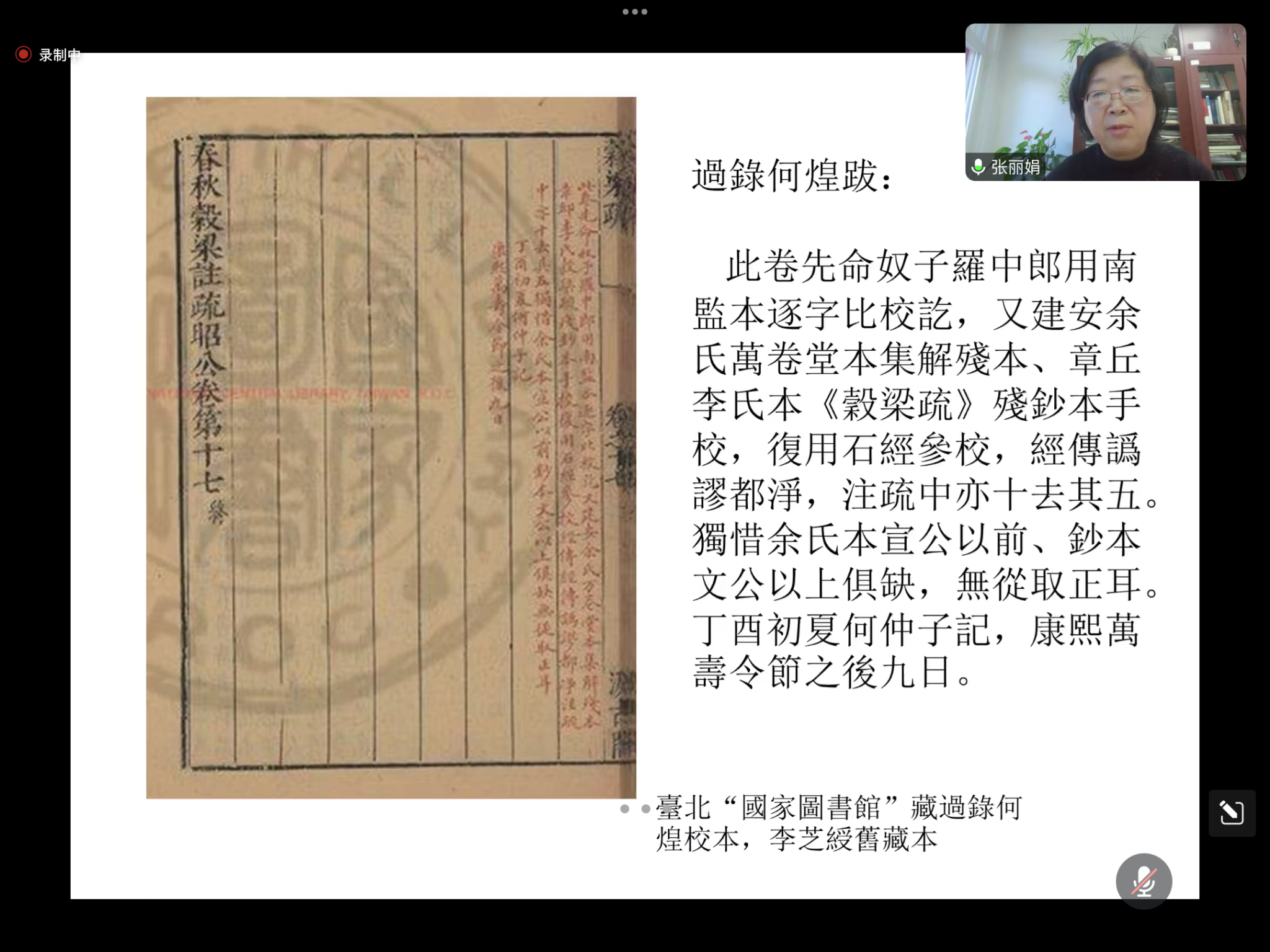 11月17日上午,“best365中国官网古籍所成立40周年系列学术讲座”第五讲在文汇楼C段424会议室举行,讲座采取线上线下结合的方式,北京大学《儒藏》编纂与研究中心张丽娟教授作了题为《单疏本<谷梁疏>在清代的传抄与校勘》的专题报告。公司周晓薇教授、王雪玲教授、郭海文教授、张宗品副教授及公司文献专业研究生、本科生等50余人参加了本次活动。讲座由吕东超副教授主持。