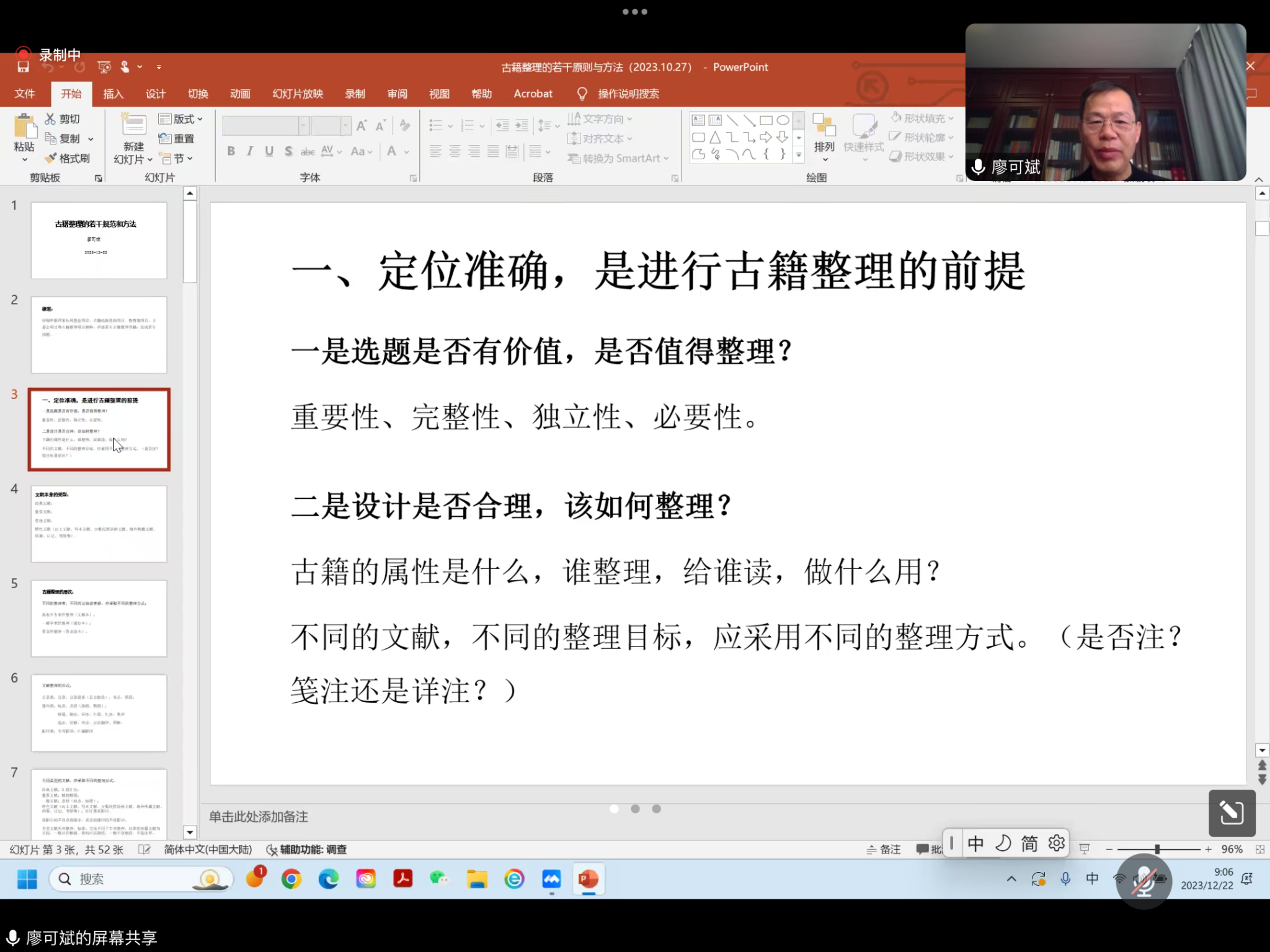 最后,廖可斌教授探讨了古籍整理的总体目标。他指出,过去的古籍整理主要强调“古为今用”的原则,而近二十年来,人们开始更加关注保存文献的原貌。然而,由于种种原因,当前的文献整理质量呈现出下降的趋势。为此,廖可斌教授提出,我们当前的古籍整理工作应该致力于追求“全、准、清、精”的目标。