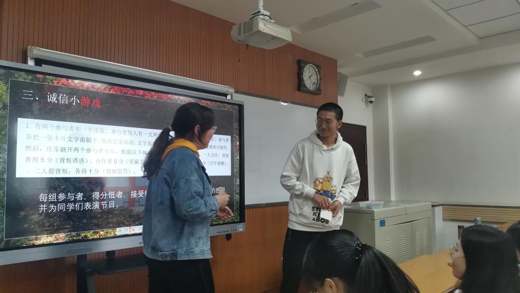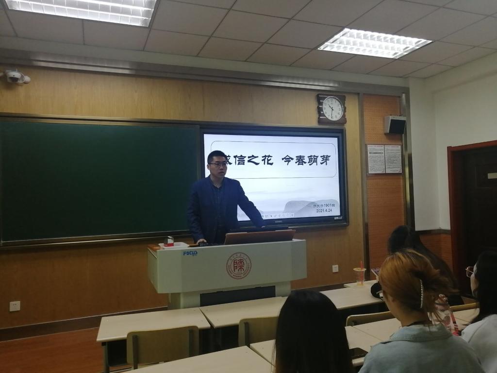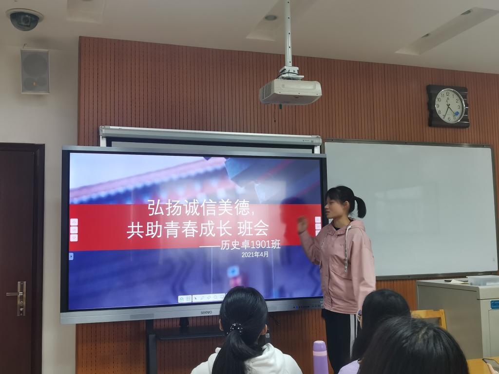 4月24日上午,2019级历史学一班在文渊楼3109开展以“诚信之花,今春萌芽”为题的主题班会。本次班会由班长周云泽主持,2019级历史学一班全体同学参与。