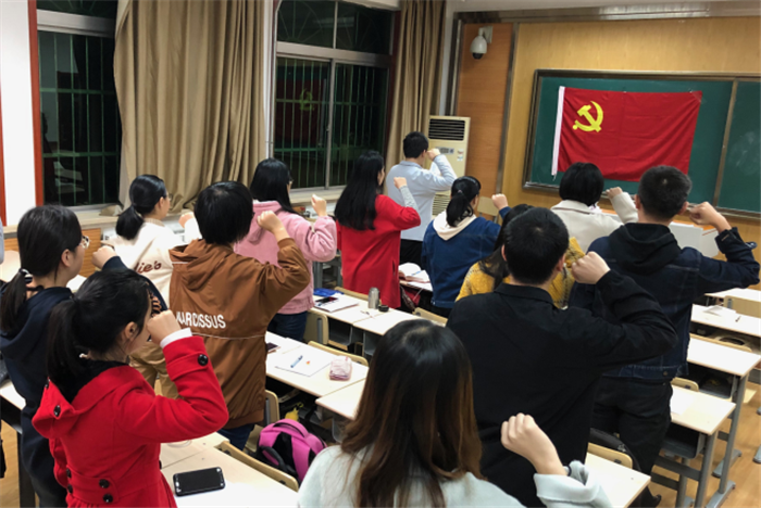在专题学习结束后,支部委员刘子明带领支部党员重温入党誓词。表达了信念和决心。宣誓结束后,支部党员积极与党旗合影,深情回忆申请入党的初心和加入党组织时的光荣。