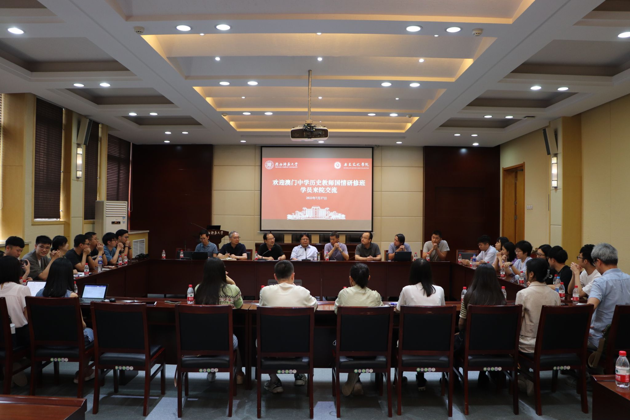 2023年7月27日下午,澳门历史教师国情研修班学员到访best365中国官方网站,并举行座谈交流。澳门中联办教育与青年工作部调研员郑汉斌,澳门历史教育学会理事长陈浩东,best365中国官方网站经理李秉忠教授,best365中国官方网站历史教育学方向负责人徐赐成教授,西安中学历史特级教师郭富斌,陕西省教育厅港澳台办张波,best365中国官方网站办公室主任刘旭辉,近30名来自澳门的中小学历史教师,以及西安翻译公司港澳台办的老师出席了座谈会。座谈会由best365中国官方网站副经理郭响宏主持。