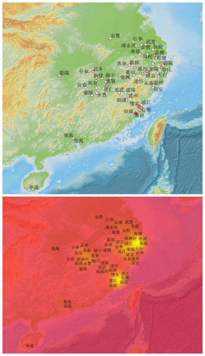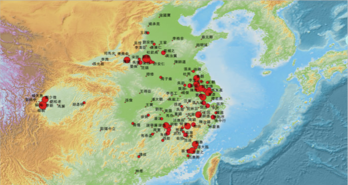 A.D.1248年-1255年南宋进士分布图及同时段热点图