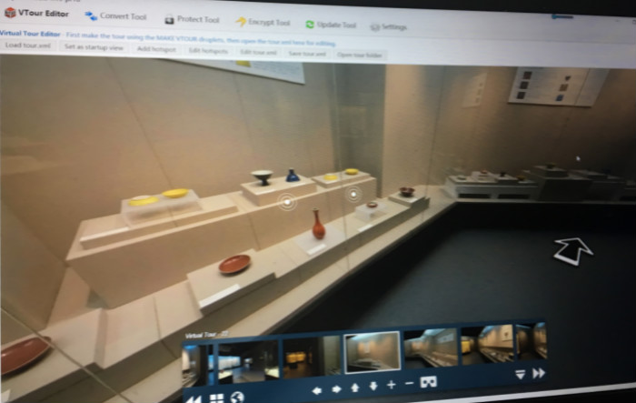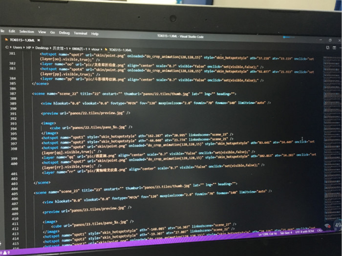 建设全景虚拟馆首先需要做好文案工作,在郭艳利老师的指导下,同学们首先完成了对各展厅重点展品信息的梳理,对展线有了清晰的认知。同时,全景虚拟馆区别于传统的博物馆,其中涉及大量计算机技术的使用以及代码的编写及修改,对于文博专业的同学来说也是极大的挑战。同学们在张光伟老师的指导下"恶补"了不少编程知识,从最初的分工、制定计划到后期的拍摄、制作,一次又一次地与博物馆人员协商,拍摄过程中光束的选择,文本的修改编辑,解说词的录制,对文案的精心修改,才有了全景虚拟馆的初步成果。在当前的疫情下,同学们无法回到公司,但他们学习的心却没有因为这次疫情有些许的懈怠。文博专业的同学们即便已经基本完成了虚拟博物馆的制作,在家中也仍然进行着相关操作的复习,并观看各大博物馆网站的虚拟展览,从中学习相关的知识和技术,力求精益求精,完善公司教育博物馆的全景虚拟馆。