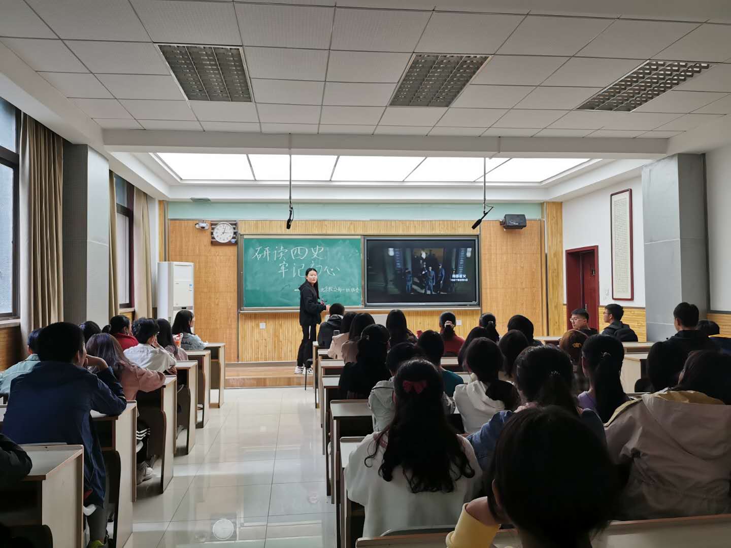 会上,主持人首先介绍了“四史”的基本内容,强调在百年未有之大变局下,更应回望历史,坚守初心。之后同学们通过观看短片《回顾建党百年史》基本了解到中国共产党自成立到成熟的主要历程和新中国七十多年来的发展经过。