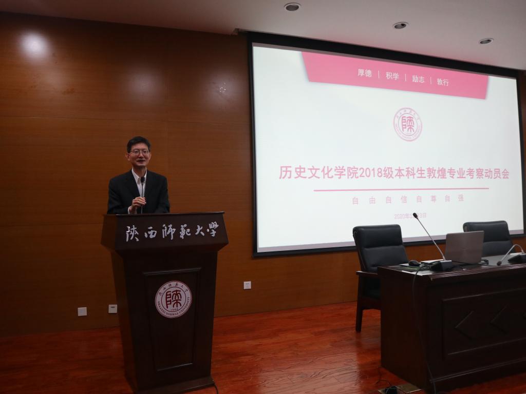 接着,经理何志龙对即将参与敦煌实践活动的2018级本科生提出了两点注意:一是疫情期间,考察出行要注重防疫安全和人身安全,要严格遵守公司相关规定,严格执行国家疫情防控规划,更要随身携带防寒服装和防疫工具。二是敦煌考察活动作为一次实践教学活动,大家在考察行程中应做好学习记录,留心观察,做到游有所得、行有所获。何经理还结合习近平总书记的甘肃考察之行和总书记对历史学及考古学的重视,号召大家要重视历史教学与历史研究,做一名合格的“历史人”。