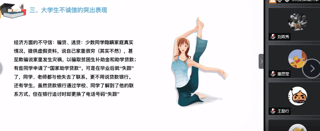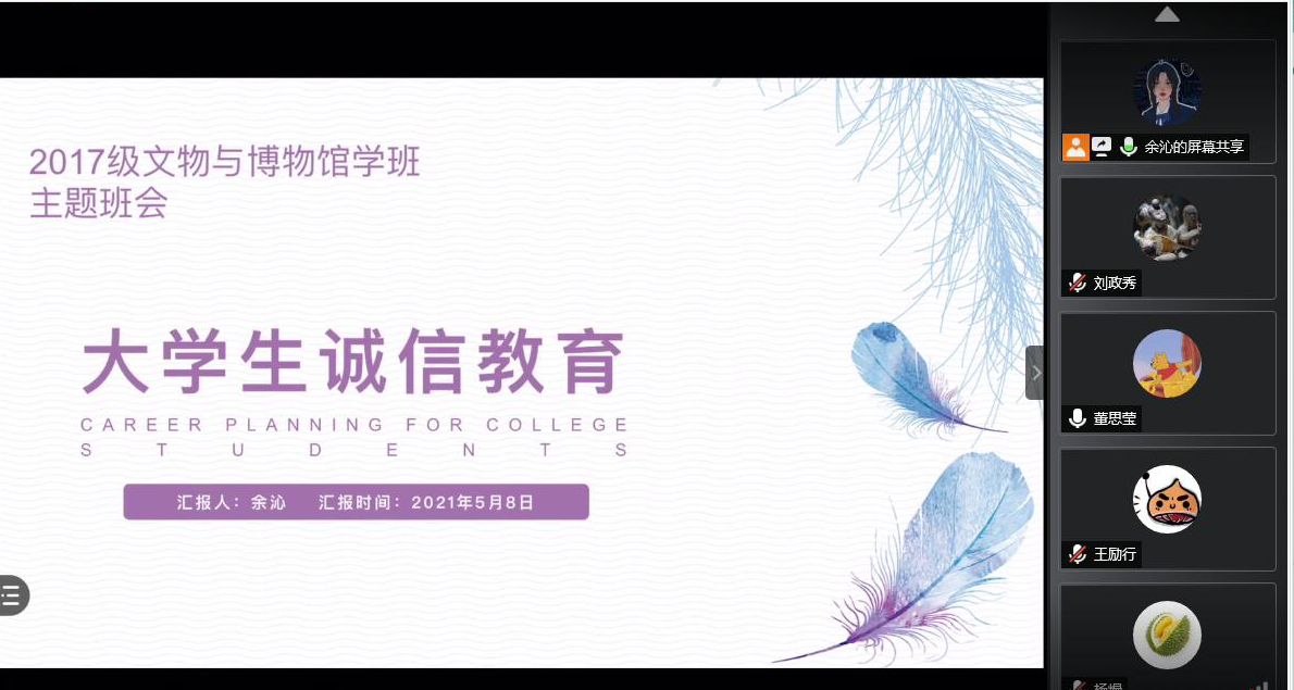 5月8日下午,2017级文博班在线上开展了老员工诚信教育主题班会活动。本次活动由班长余沁主持,文博班全体成员参与。