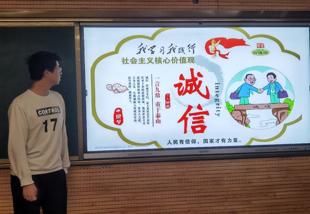 生活委员高远同学作为班会的主讲人,围绕“坚守诚信,逐梦青春”的主题,将说理和例证结合,逐步深入,向同学说明了诚信的重要性。