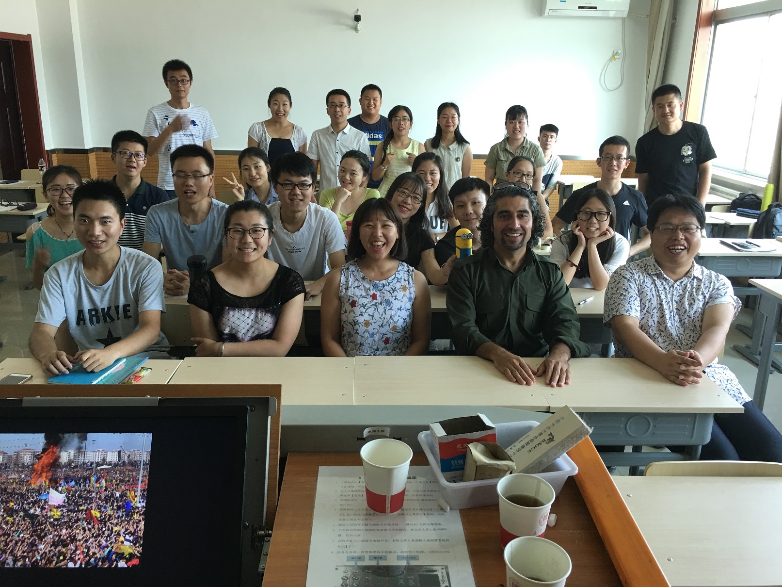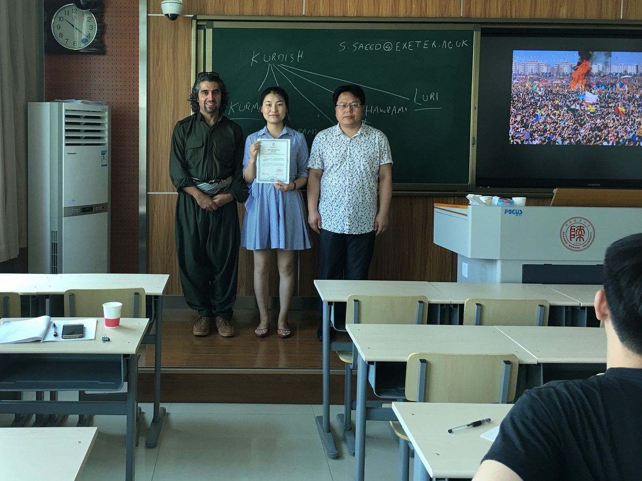 Seevan Saeed博士的授课内容主要分为三部分:在第一部分,他启发同学们去思考“中东”这一名词是地理命名还是政治标签,中东国家与阿拉伯国家、第三世界和发展中国家之间的范畴,并从西方殖民主义的入侵和中东民族主义的兴起两个方面对中东概念的形成进行了详细的阐述。第二部分则主要围绕文化生活和社会状况展开,从伊斯兰教的诞生,到其成为世界上三大宗教之一,他用形象生动的图片、视频为同学们讲述了阿拉伯人在包括建筑、雕塑、语言、文学、音乐、艺术等科学和文化领域的发展和进步。第三部分则主要讲述了中东第四大民族—库尔德人的历史发展脉络,其独特的民族习俗和文化传统,在中东四国的分布状况,以及库尔德问题对中东国家关系的影响。