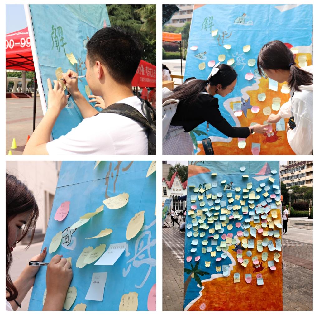 5月22日清晨,公司研究生会工作人员迅速就绪,将活动所需物资及场地设施运送至活动地点并快速搭建完成,上午9点,活动准时开始。本次活动有两大主要项目:“解忧海”及绿植领养。所谓“解忧海”,是用便利贴写下自己目前的烦恼或心愿,张贴在预置展板的“海洋”上,等待其他同学在贴纸上写上鼓励或祝福,并把贴纸带离“海洋”。而绿植领养,采取了套圈游戏的趣味形式,以分数换取植物种子或多肉植物的奖励。
