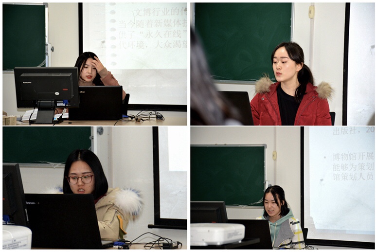 本次论坛分为两个小组,即文博组与考古组,采取员工PPT演讲与老师评议相结合的方式。文博组由冀佳颖、焦冠钊、汪贵元、赵维娜、范丹妮、刘妍钧、王娅、乌德宝丽8人组成,分别就博物馆目前在陈列展览、研学旅行、教育体验项目、残障人士服务、文创产品开发与设计、纸质文物保存现状、文化遗产发展、文化资源开发等问题进行探讨。