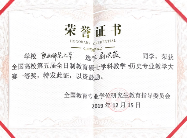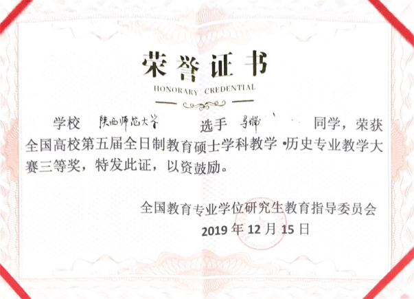 12月12日至12月15日,全国高校第五届全日制教育硕士学科教学(历史)专业教学技能大赛在山东曲阜师范大学举行。公司蔡娜副教授带领的两名学科教学(历史)专业硕士研究生在比赛中表现出色,取得了优异成绩。