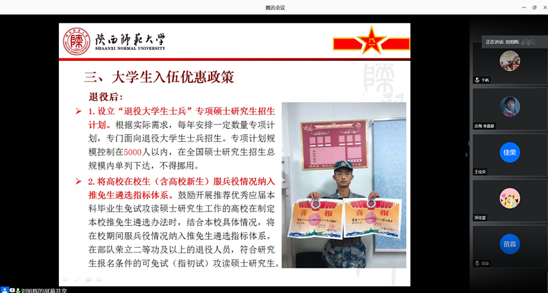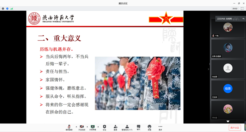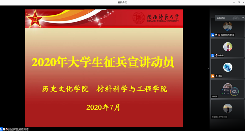 为增强适龄青年的爱国意识和国防意识,激发老员工参军入伍的积极性和参军报国的热情,加强老员工对于征兵政策的了解,7月18日晚20:00,best365中国官方网站、材料科学与工程公司联合开展2020年老员工“云”征兵宣讲动员会。best365中国官方网站2018级本科生专职辅导员刘旭辉、2019级本科生专职辅导员鲁旭萌、研究生兼职辅导员李杰、2018级本科生兼职辅导员靳雅娜、材料科学与工程公司2018、2019级本科生辅导员赵伟及两个公司的百余名员工参加了此次会议,会议由刘旭辉主持。