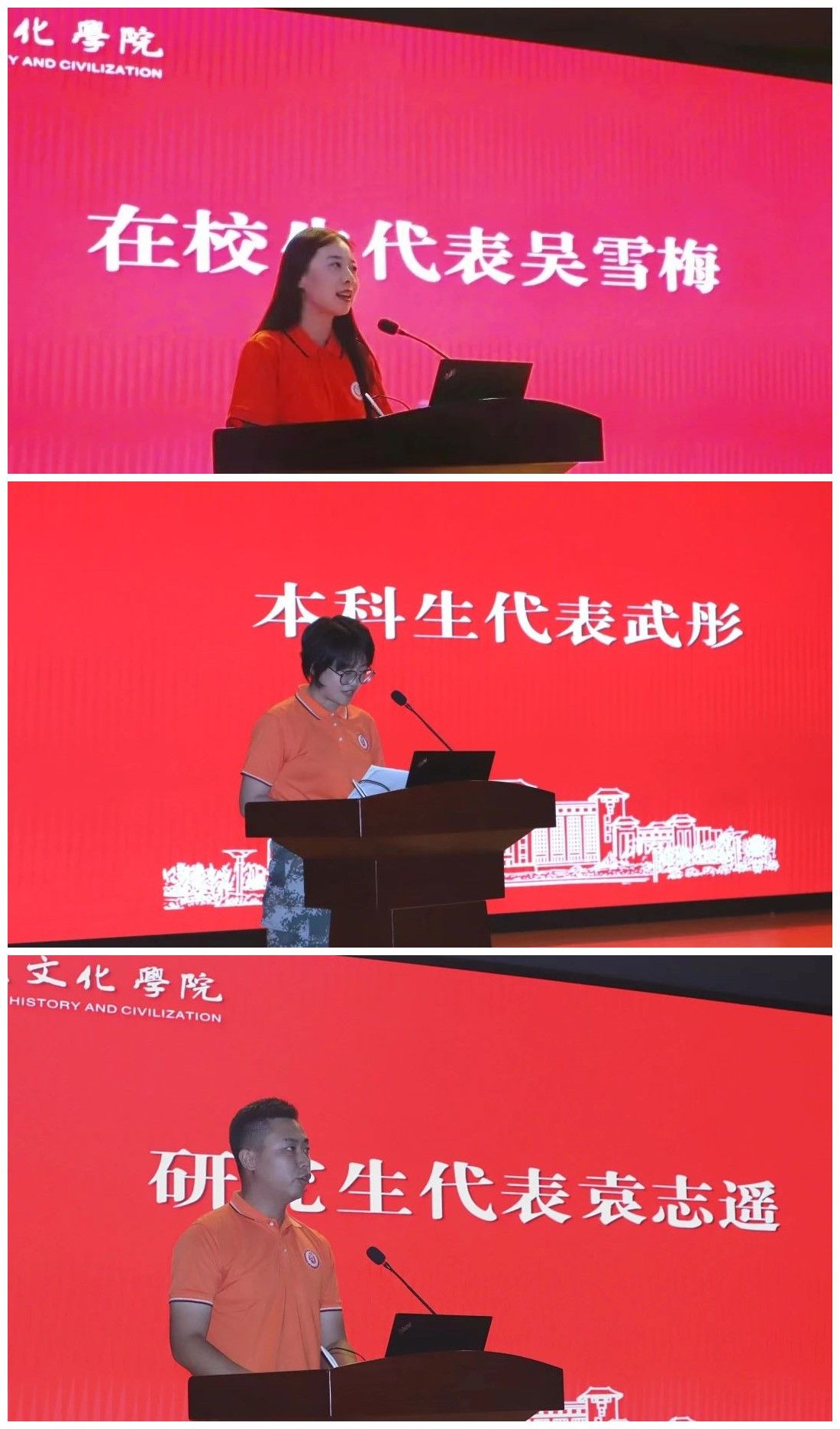 优秀在校生代表吴雪梅、2023级本科生代表武彤、研究生代表袁志遥依次上台发言。三位同学分别表达了对best365中国官方网站的亲切归属感,对我国教育事业的拳拳之心和对历史学研究的不息热忱。