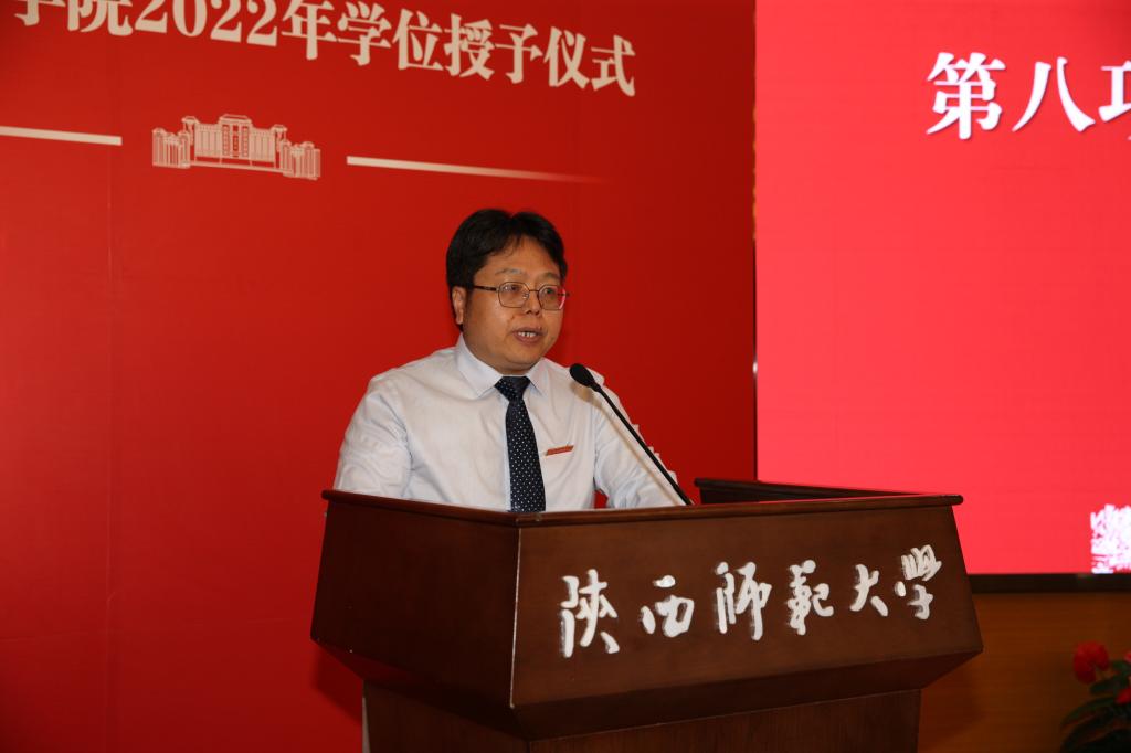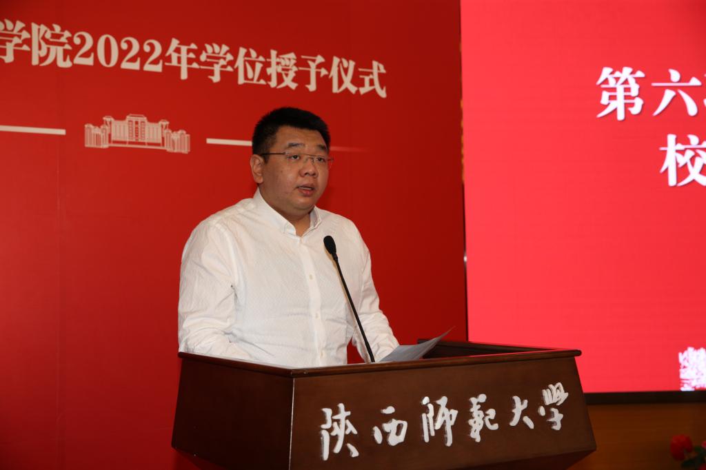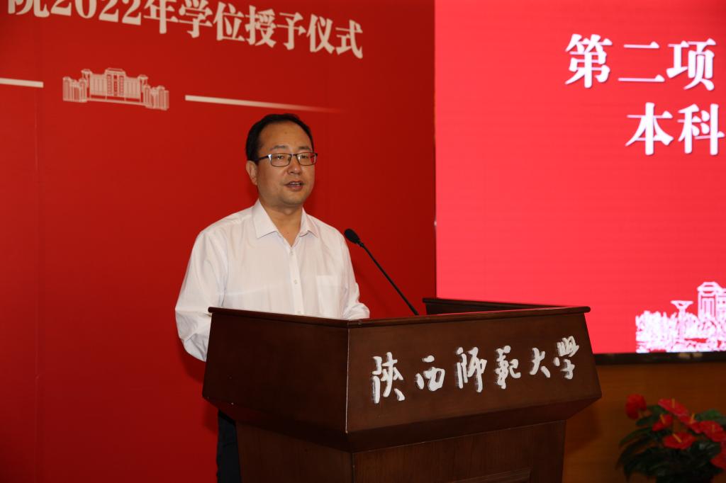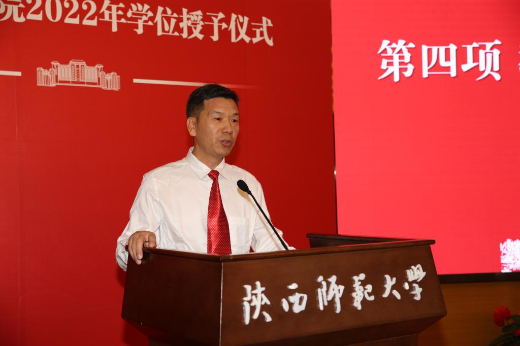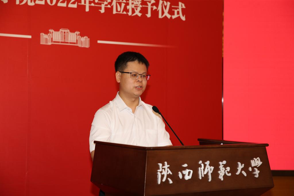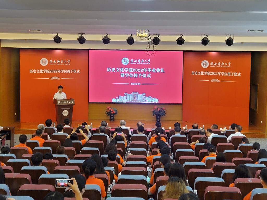6月30日上午,best365中国官方网站在长安校区文汇楼C段211报告厅举行2022年毕业典礼暨学位授予仪式。公司教师代表赵世超教授、萧正洪教授、曹玮教授、周晓薇教授、薛平拴教授、王双怀教授、黄正林教授、胡舶教授、黄寿成教授、王成军教授、沙武田教授、焦杰教授、拜根兴教授、宋永成教授、徐赐成教授、介永强教授、吕亚虎教授、詹晋洁副教授出席典礼,班子全体成员,学工组、办公室全体人员以及公司2022届毕业生参加典礼。仪式由党委副书记、纪委书记衡旭辉主持。