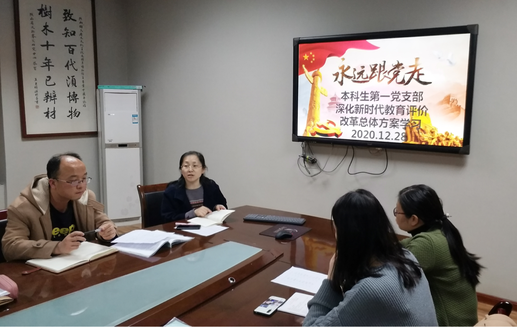 2020年12月28日15:30,本科生第一党支部在文汇楼C段217会议室组织召开《深化新时代教育评价改革总体方案》微党课学习及预备党员转正会议。公司党委副书记程蕾、本科生第一党支部书记洪海安、2018级辅导员刘旭辉,以及本科生第一党支部预备党员、发展对象参与了本次会议。会议由本科生第一党支部副书记崔琳同志主持。