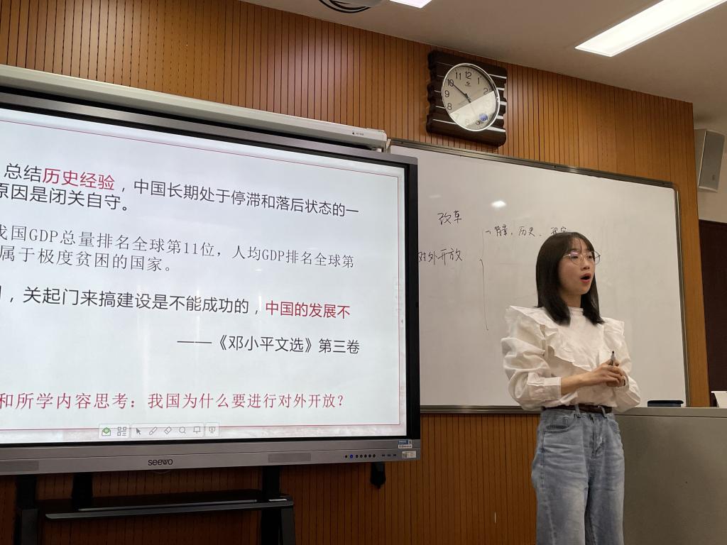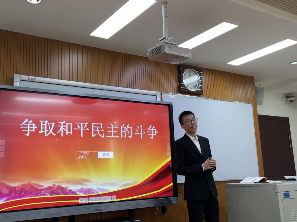 比赛中,同学们的表现精彩不断:周云泽同学以幽默激昂的语言,深入浅出地说明了红军长征的原因以及“长征精神”的时代价值;韩旭同学思路清晰,以明确的线索为我们再现了重庆谈判的历史情境,并通过古今对比,体现出了毛泽东毅然决然赴重庆谈判的民族大义;饶媛同学立足改革开放实践,把握课程标准,语言通俗流畅,在一则则材料中分析了对外开放之初的国际国内环境;董玉虎同学以恰到好处的课程导入与课件展示,为我们展示了敌后战场抗战的艰辛与伟大;蒋嘉君同学以工农武装割据为主题,以老道的讲解,与课件的高配合程度,展现出了前辈们开辟革命新道路的历史征程……