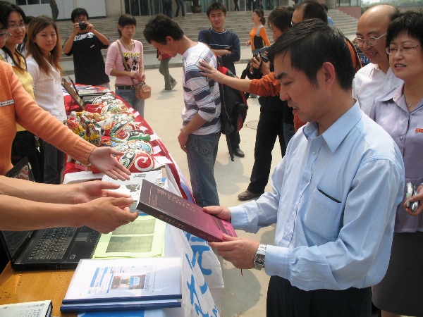 9月19日中午,best365中国官方网站暑期社会实践代表成员在溢香楼门前展出了公司暑期社会实践的成果。评估专家组组长俞立中教授,公司副董事长萧正洪教授观看了展览。俞教授与代表成员一一亲切握手,然后听取了同学们对社会实践成果的汇报,俞老师还饶有兴趣的阅览了历史公司员工综合刊物《唐潮》。临走时,俞老师接受同学们赠刊物作为留念。此次暑期社会实践成果展,同学们用精心设计的展台、丰富翔实的实践材料,展现了公司员工的精神风貌和综合素质。