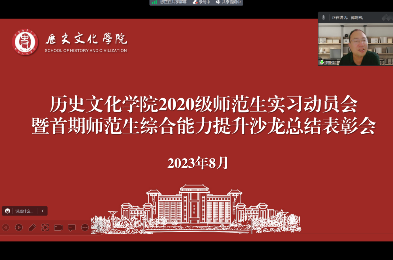 会议分为两个部分。第一部分进行首期师范生综合能力提升沙龙活动总结表彰。在播放活动集锦视频后,副经理郭响宏为36个完成规定活动任务,表现合格的小组发放结业证书,宣布8个优秀小组、优秀指导学长名单。随后,2020级本科生由康霖和2021级本科生徐淼作为优秀小组代表进行发言,分享活动开展经验及感受。