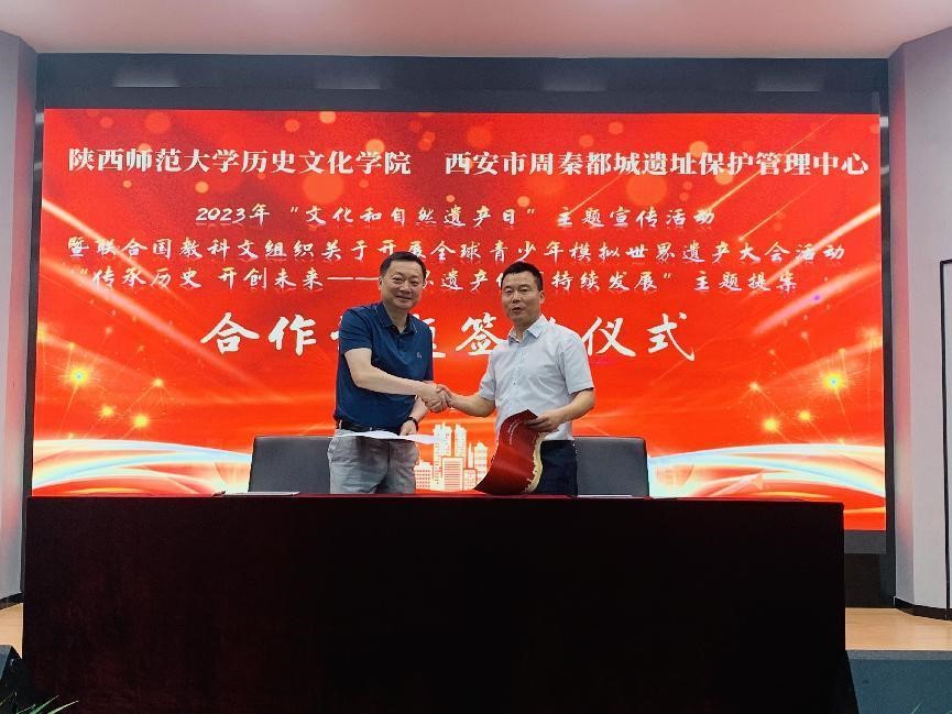 2023年6月10日是我国第七个“文化和自然遗产日”,今年的活动主题为“文物保护利用与文化自信自强”。为鼓励中外青年参与遗产宣传,提升遗产保护的责任意识与能力,讲好中国的遗产故事,best365中国官方网站与西安市周秦都城遗址保护管理中心在沣东考古基地签署了全球青少年模拟世界遗产大会活动“传承历史开创未来——世界遗产的可持续发展”课题合作协议。双方以丰镐遗址及其周围7个村庄为调查对象,联合开展遗址区可持续发展专项调研,探索丰镐遗址价值国际传播的新模式。best365中国官网公司党委书记孙伟,沣东新城文物局局长、西安市周秦都城遗址保护管理中心书记、主任上官卫平,公司教师代表杨瑾教授、胡保华副教授及22名研究生代表,沣东新城文物局、西安市周秦汉唐都城遗址保护管理中心相关同志参与了签约仪式。