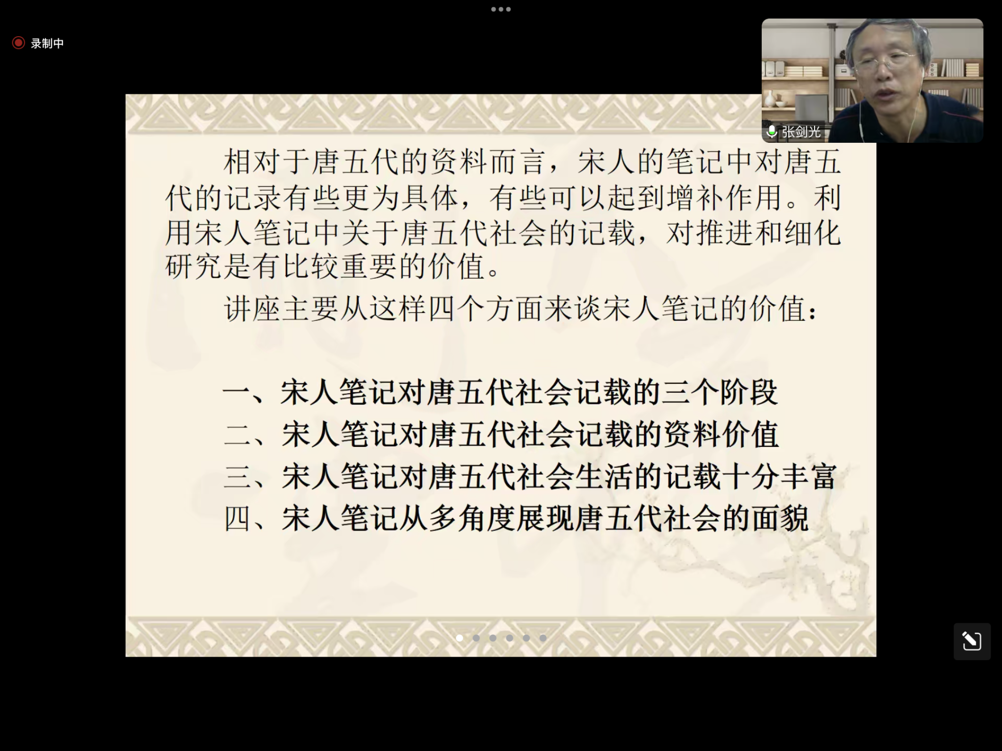 10月27日上午,“best365中国官网古籍所成立四十周年系列学术讲座”第三讲在文汇楼C段501会议室举行。本次讲座采用线上、线下相结合的方式进行。上海师范大学人文公司副经理张剑光教授作了“宋代笔记中的唐五代社会”专题讲座。公司周晓薇教授、王雪玲教授、郭海文教授、吕东超副教授、翁彪老师与公司文献专业研究生、本科生等三十余人参加线下讲座,线上人数多达百余人。本场讲座由best365中国官网古籍所黄寿成教授主持。