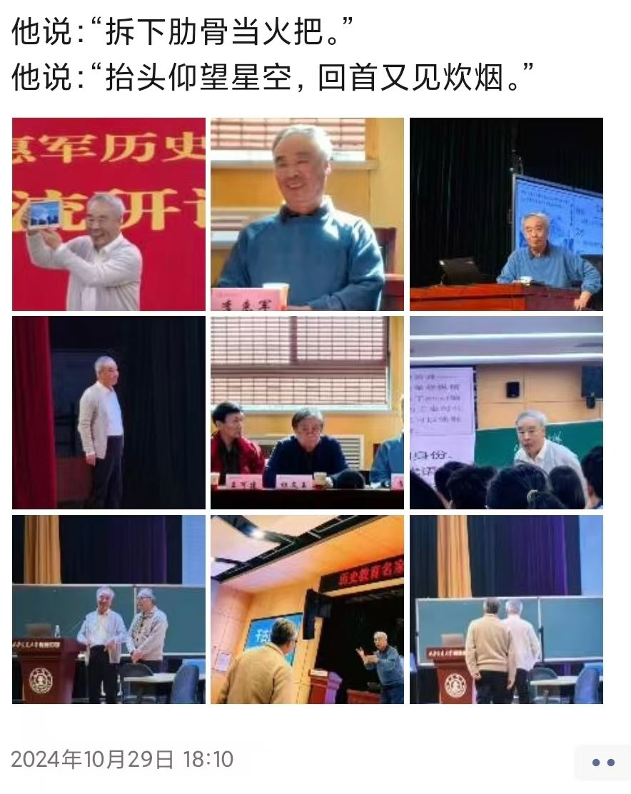 “我眼中的李惠军老师是一位拥有厚重历史底蕴的长者,一位拥有浪漫情怀的诗人,他却说自己只是一位老耕夫。我看见他拆下肋骨当火把,带来这曲生命之舞。师者,以德而耕,拾获山河。”2022级本科生刘昕南说。她被李惠军老师用一生躬耕教坛所积淀的历史教学艺术与伟大人格魅力所感动,心中千言万语难以诉尽对李惠军老师的敬意。