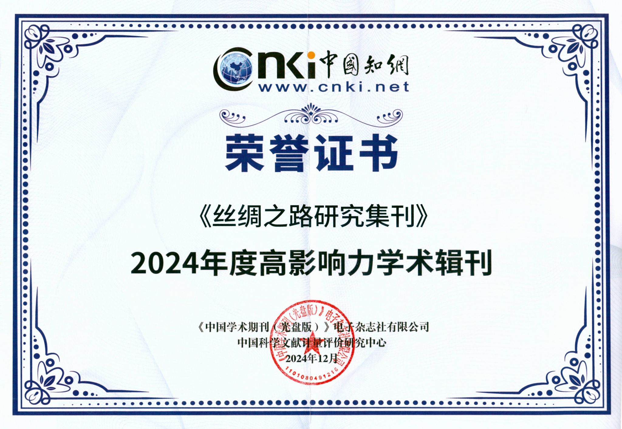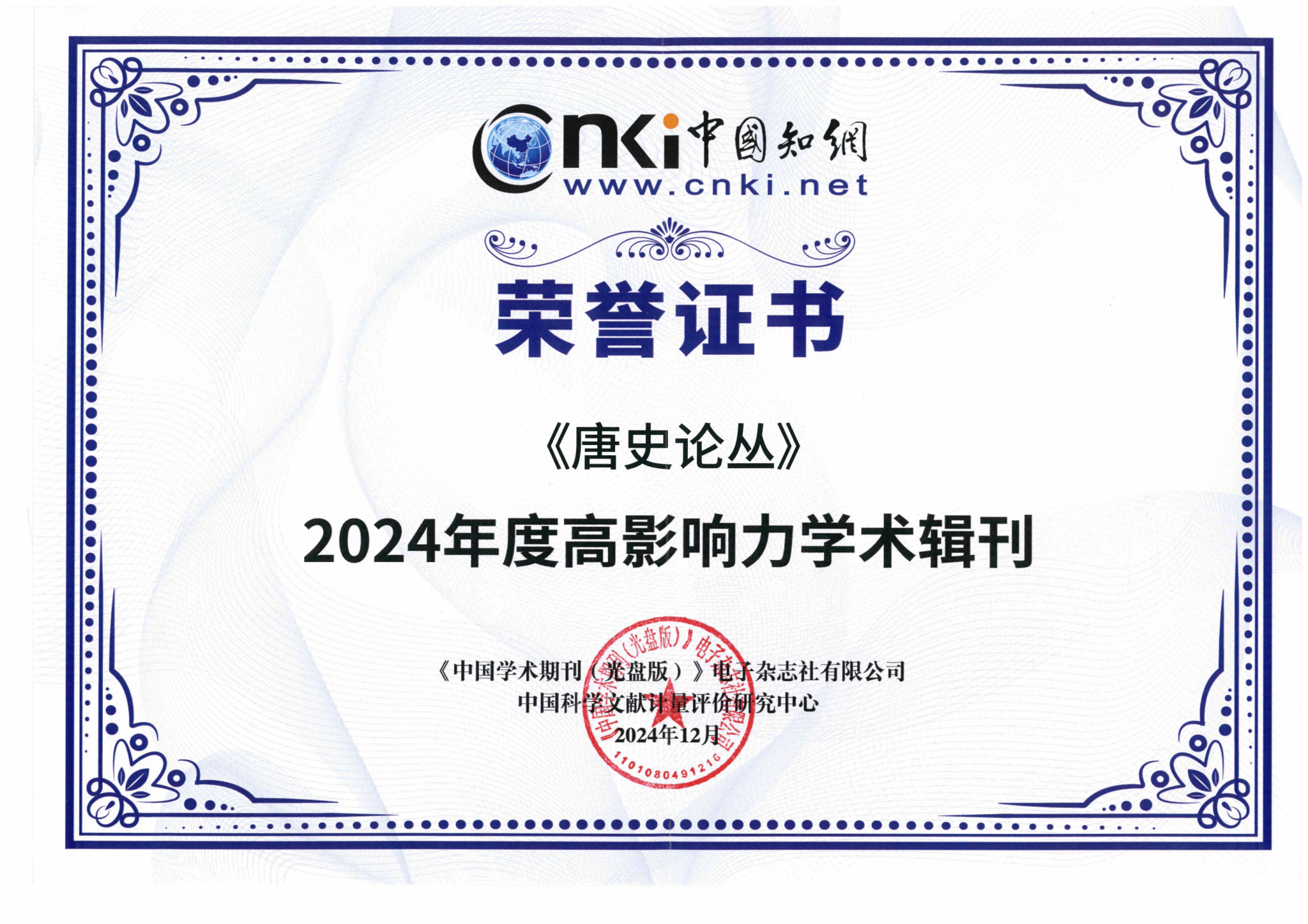 2024年12月24日,中国知网在北京召开2024年度知网学术影响力评价系列报告发布会,会上发布了《高影响力学术辑刊评价报告(2024)》,公司《唐史论丛》《丝绸之路研究集刊》入选“2024年度高影响力学术辑刊”。
