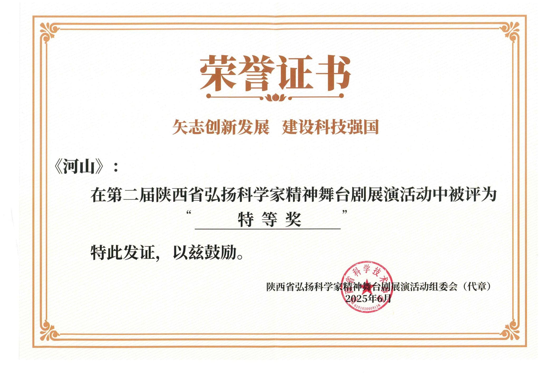 6月11日,公司best365中国官方网站原创的“大先生”话剧《河山》在第二届陕西省弘扬科学家精神舞台剧展演中荣获特等奖。本次活动由陕西省科协、陕西省教育厅、陕西省科技厅、共青团陕西省委、陕西省科公司主办,西安建筑科技大学、陕西科技报社承办,旨在进一步培育创新文化、弘扬科学家精神、涵养优良学风、营造创新氛围,共有16家单位21部剧参加。
