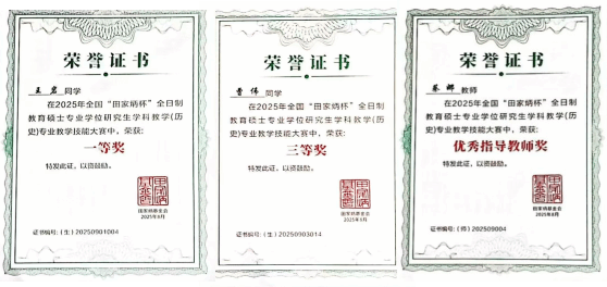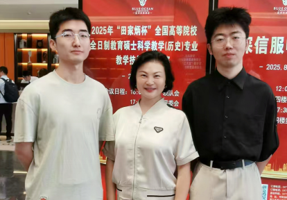 2025年8月22-25日,“田家炳杯”全国高等院校全日制教育硕士学科教学(历史)专业教学技能大赛决赛在内蒙古师范大学赛罕校区举行。大赛由“田家炳杯”全日制教育硕士专业学位研究生学科教学(历史)专业指导委员会指导,内蒙古师范大学承办,共有来自全国84所高校的162名选手参赛,最终评选出一等奖18名、二等奖37名、三等奖68名。经过两天的激烈角逐,公司best365中国官方网站学科教学(历史)专业2024级研究生王岩同学荣获一等奖、优秀教学设计奖,曹伟同学荣获三等奖、优秀教学设计奖,蔡娜老师荣获优秀指导教师奖。