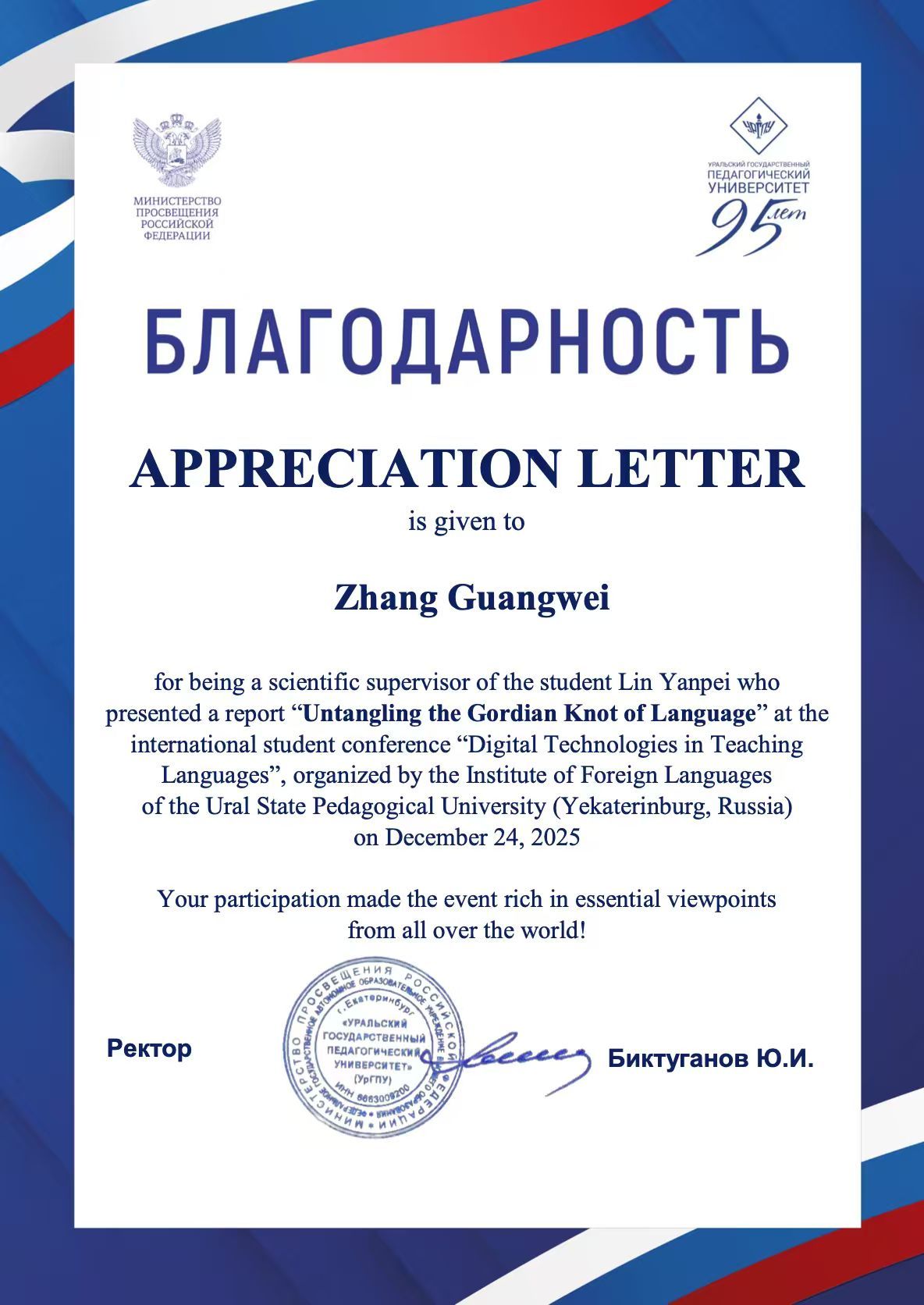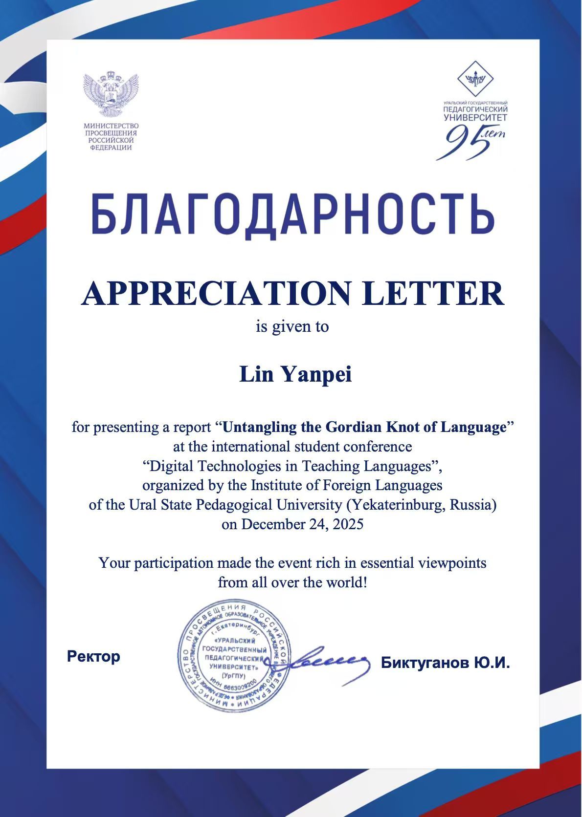 2025年12月,由俄罗斯乌拉尔国立师范大学(Ural State Pedagogical University)主办的“数字技术在语言与文化教学中的应用”国际研讨会在线上举行。公司2025级学科教学(历史)专业硕士研究生林炎培在张光伟老师的指导下,撰写并宣读了题为“Untangling the Gordian Knot of Language: How AI Can Liberate Lexicons and Create Immersive Learning Experiences”(解开语言的戈尔迪之结:人工智能如何破解循环定义并创造沉浸式学习体验)的学术报告,这充分展现了公司学子在“人工智能+历史教育”领域的探索精神与专业自信。与会国际专家对报告中提出的利用AI技术打破语言学习壁垒、深化历史语境理解的教学新范式给予了高度评价。